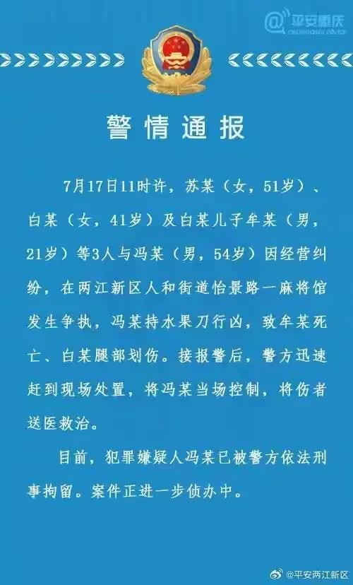 7月17日,重庆发生一起刑事案件,致一人死亡,犯罪嫌疑人已被抓获。