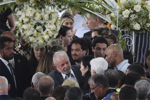 巴西总统卢拉-达-席尔瓦在告别仪式现场安慰贝利妻子玛西娅-奥基↑