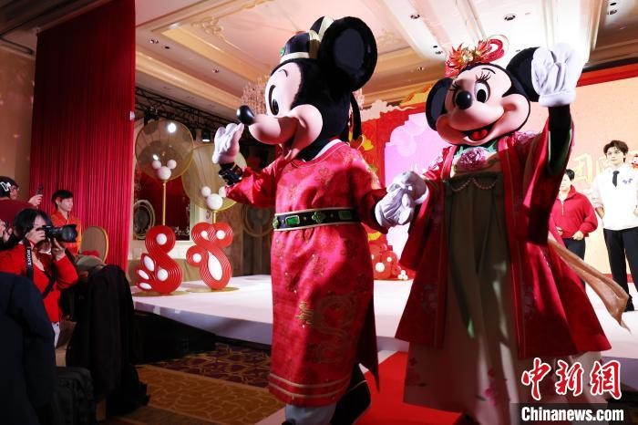 中国农历新年即将来临,1月8日,米奇、米妮身穿新年盛装携手迪士尼朋友全新亮相,吸引了众多关注的目光。中新社记者 汤彦俊 摄