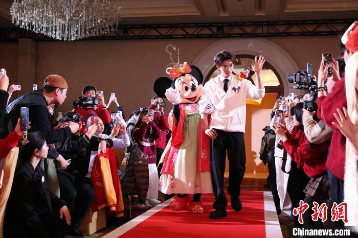 中国农历新年即将来临,1月8日,米奇、米妮身穿新年盛装携手迪士尼朋友全新亮相,吸引了众多关注的目光。图为:米奇携手倪夏莲走上T台。中新社记者 汤彦俊 摄