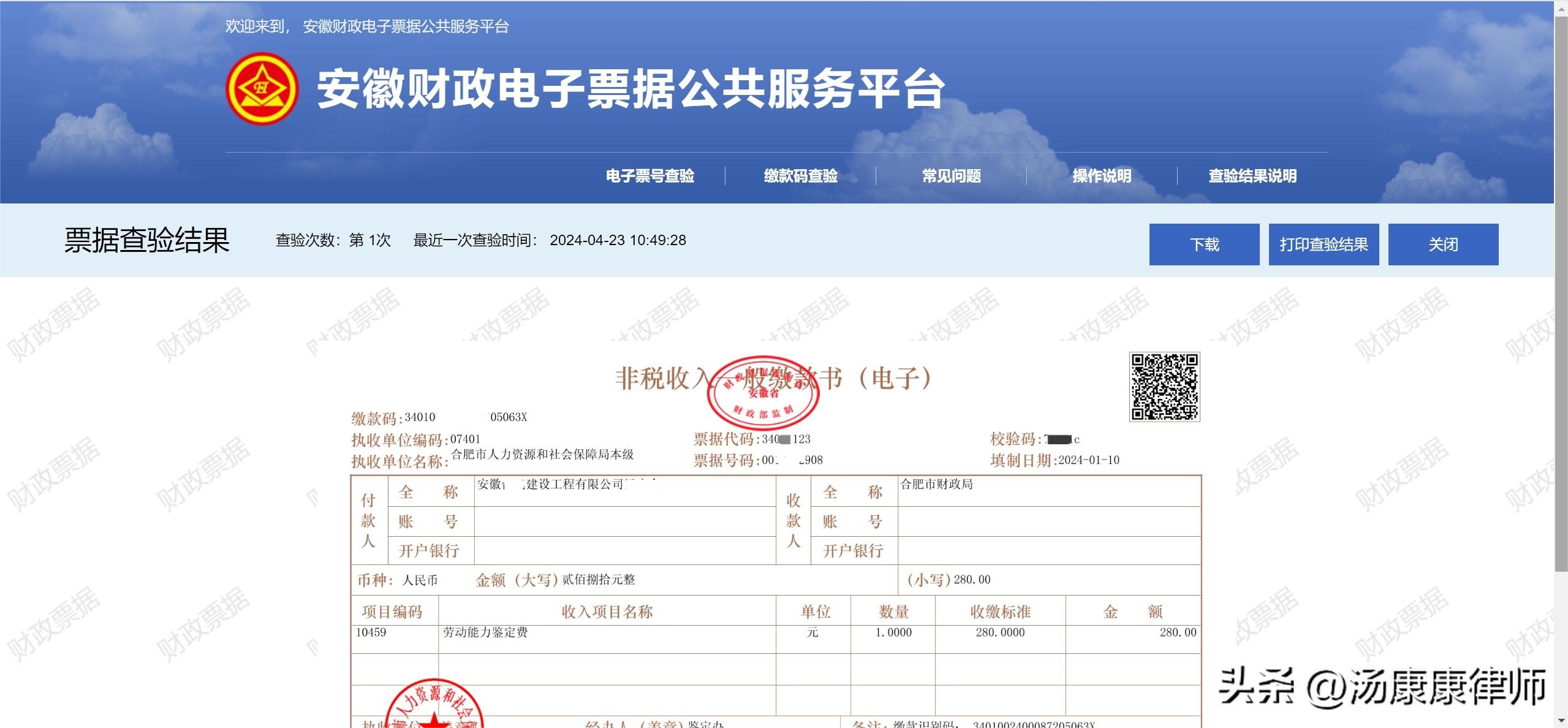 缴纳工伤鉴定受理费、法院诉讼费等各种政府收款费用,凭缴款通知单上的缴款识别码(一般是20位的数字+字母),登录安徽财政电子票据公共服务平台(