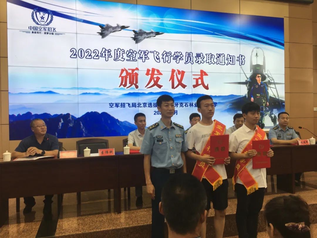 日前,牙克石林业第一中学2022届毕业生李绍祺、王礼明被中国人民解放军空军航空大学录取。在空军飞行学员录取通知书颁发仪式上,空军招飞局北京选拔中心、呼伦贝尔市教育局相关负责人为李绍祺、王礼明颁发飞行学员录取通知书、喜报和荣誉证书,还为录取学生班主任颁发了育鹰奖荣誉证书,为牙克石林业一中颁发优质生源基地牌匾和喜报,为牙克石林业一中校长颁发突出贡献奖。