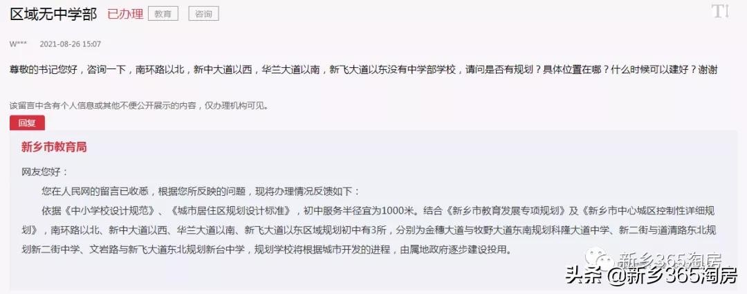 针对此问题,新乡市教育局8月30日给出的回复是,依据《中小学校设计规范》、《城市居住区规划设计标准》,初中服务半径宜为1000米。结合《新乡市教育发展专项规划》及《新乡市中心城区控制性详细规划》,南环路以北、新中大道以西、华兰大道以南、新飞大道以东区域规划初中有3所。
