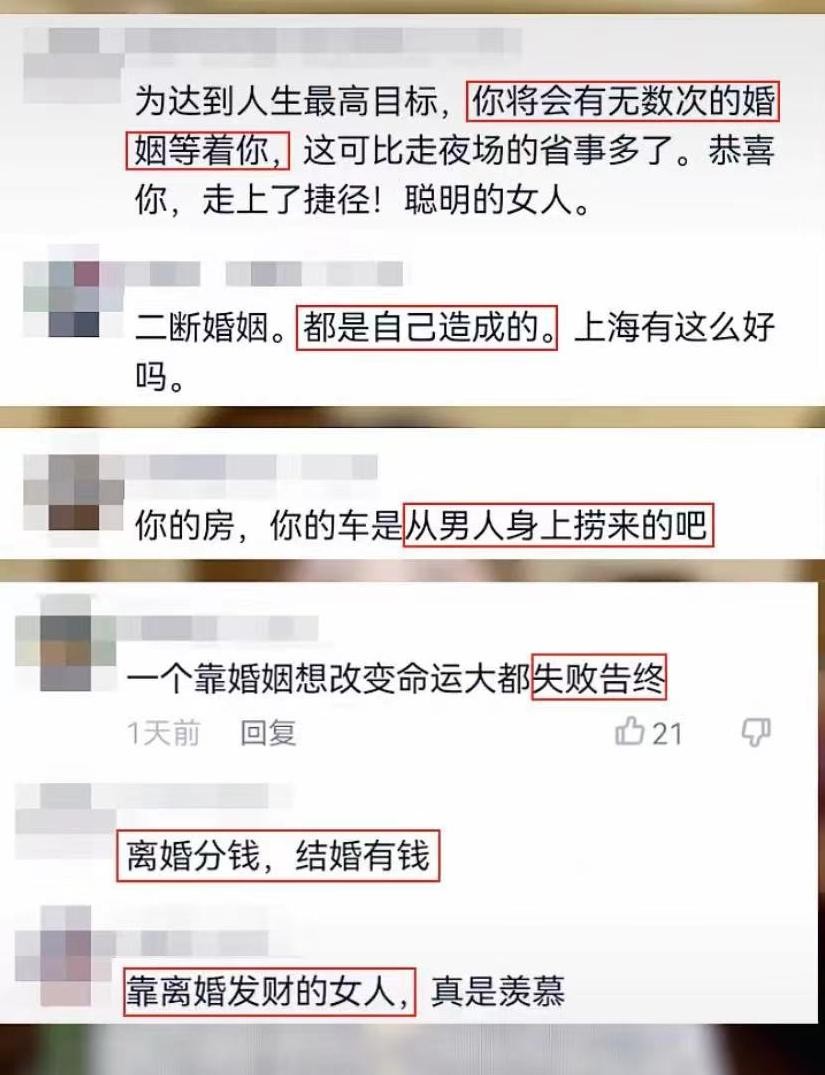 但没想到,她离婚后要面对的恶意比男人多上很多,特别是她这种公众人物。翻看社交平台的各种网友评论,许多都不堪入目。有人讽刺她是靠离婚发财,甚至猜测她的车子房子都是从男方那里“捞”来的。