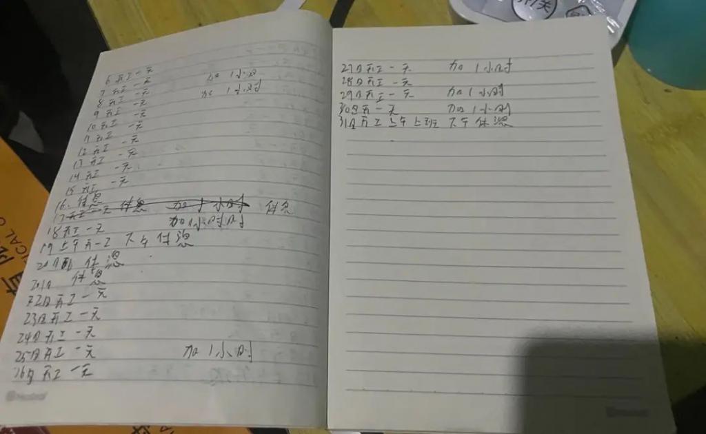 尚金勇房间里,一顶安全帽摆在门口不远处,一本笔记本仍留在桌上。本子内基本只记录日期和当日是否工作,最后一行写着:(10 月)31 日开工,上午上班,下午休息。