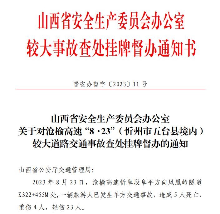 2023年8月23日,沧榆高速忻阜段阜平方向凤凰岭隧道K322+455M 处,一辆旅游大巴发生单方交通事故,造成5人死亡,重伤4人,轻伤23人。8月24日,山西省安全生产委员会办公室发布“关于对沧榆高速“8·23”(忻州市五台县境内)较大道路交通事故查处挂牌督办的通知”,要求查明事故原因,认定事故性质,分清事故责任,研究提出对有关责任单位和责任人的处理意见,依法依规妥处善后。
