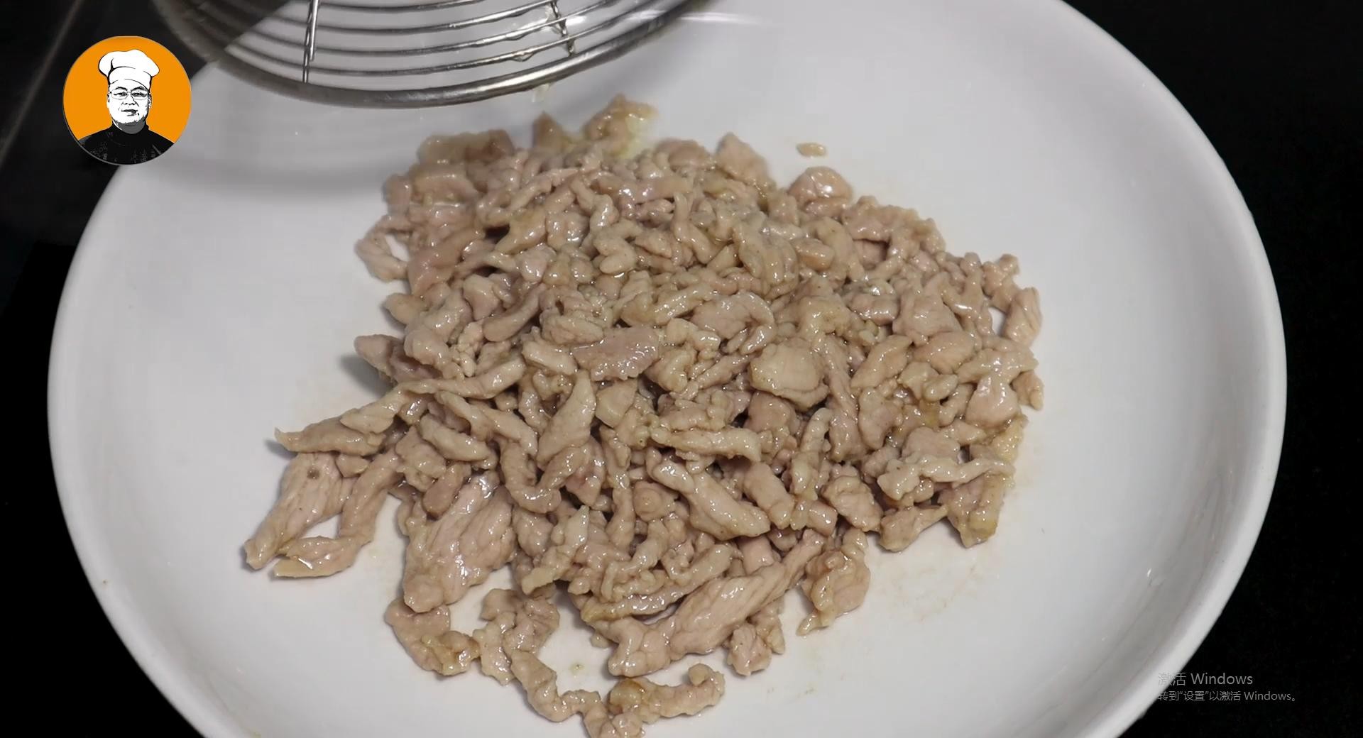 4、先把猪肉切丝放入碗中,再用水泡十分钟,时间到时,挤干水分。再把肉丝腌制下。先放入半勺食盐、半勺味精、白胡椒粉、蚝油,泡好水的山芋粉,揉抓均匀,再淋上少许食用油,腌制半小时备用
