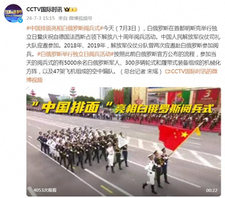 2018年、2019年,解放军仪仗分队曾两次应邀赴白俄罗斯参加阅兵。按照此前白俄罗斯官方公布的流程,参加当天的阅兵式的有5000余名白俄罗斯军人、300多辆轮式和履带式装备组成的机械化方阵,以及47架飞机组成的空中编队。(总台记者 宋瑶)
