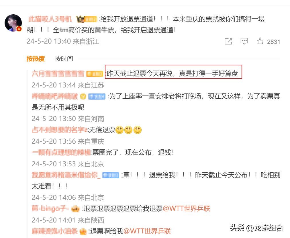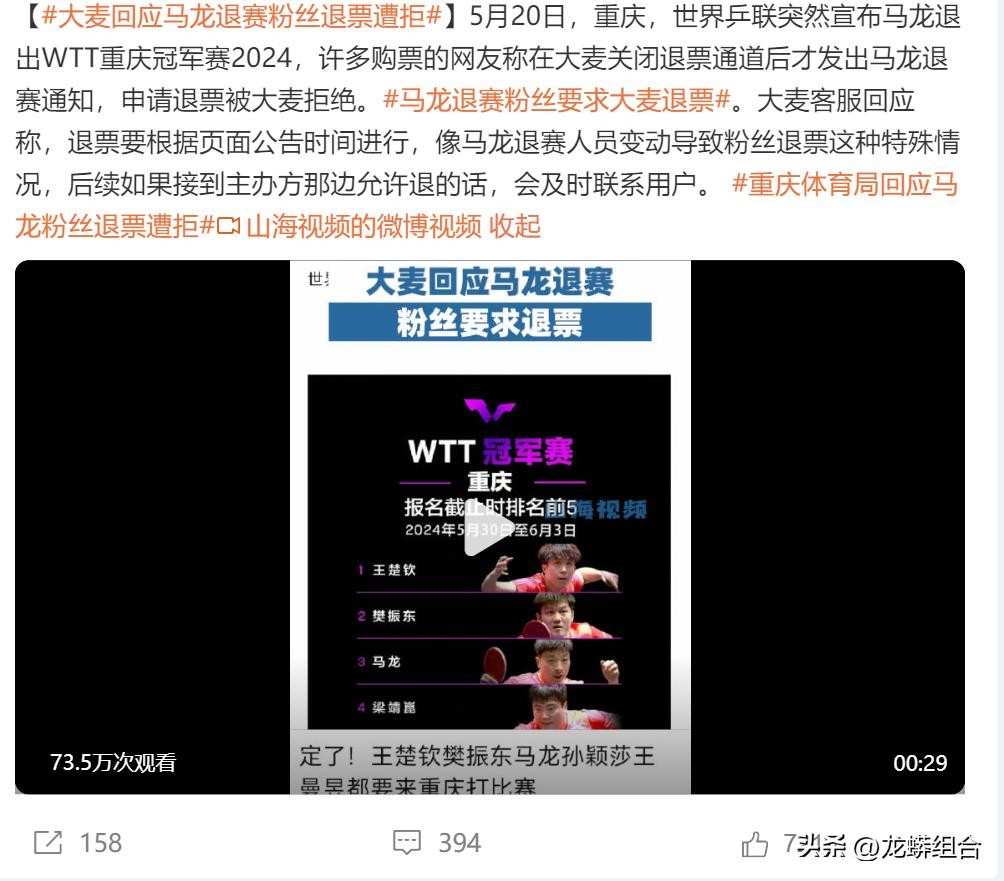 5月19号,售票平台的退票截止日期。5月20号,WTT世界乒联官宣马龙退赛。