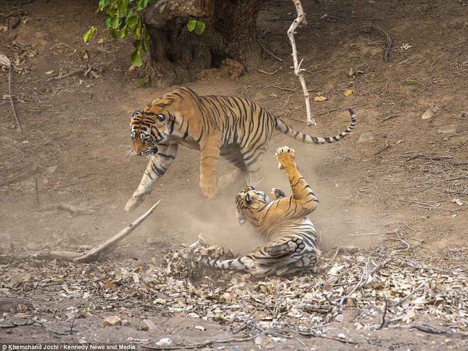 摘要: 近日,印度拉贾斯坦邦伦腾波尔国家公园内的雌雄两虎为争夺领地上演了极为激烈的一幕,场面十分刺激生动。照片中,雌雄两虎为争夺领地展开了猛烈竞争,年轻的母虎伸直后腿,将前爪顺势展开,摆出了站街姿势,一股霸气 ...