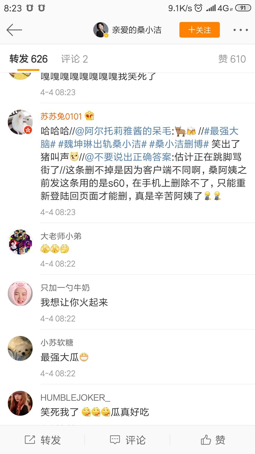 然后魏教授跟鲍橒的瓜还没结束,今天有意思的一幕就发生了,《最强大脑》制作人桑小洁清空了微博内容,谁能想到此前在微博一直怼天怼地怼空气的桑某居然会清空了微博,也许这要感谢魏教授昨天微博的神助攻吧。除此之外,还被扒出两人是RT关系,#魏坤琳出轨桑小洁#话题成为众多网友讨论的焦点。