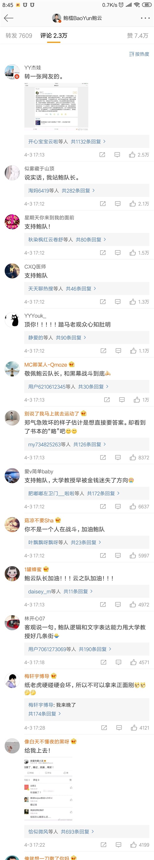 鲍橒微博下都是支持的声音