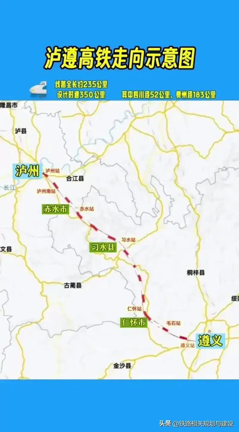 泸遵高铁,它是蓉遵高速铁路的泸州至遵义段,线路起于四川省泸州市,止于贵州省遵义市,全长235公里,其中泸州市境内52公里,遵义市境内182公里。铁路标准为双线、客运专线,设计行车速度350公里每小时,总投资539亿元。途径龙马潭区、江阳区、合江县,赤水市、习水县、仁怀市,拟设泸州北站、泸州站、赤水站、习水站、仁怀站、毛石站、遵义站等7个车站。