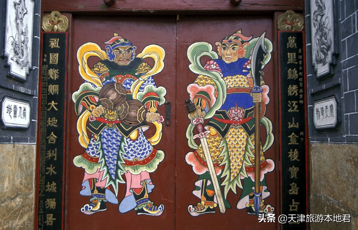 影壁上是观音菩萨普度众生的故事,两侧是门神尉迟恭和秦琼的雕像。