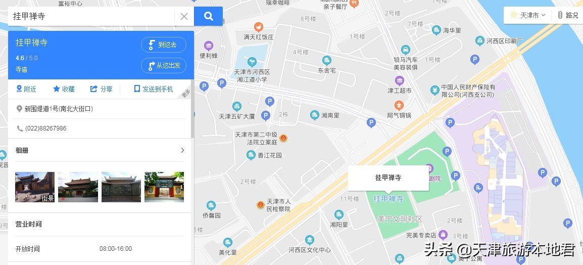 挂甲禅寺位于河西区新围堤道东侧,海河南岸,附近有成熟的商业和居民区。距离最近的是1号线土城地铁站,步行需要近1公里,大家要提前规划好路线。