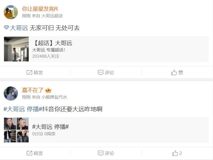 大哥远停播的消息让人们不知所措,有人表示:“大哥远不是怎么事啊家人们,我刚进播间两分钟人都没见着,回来就说无期限停播再也不见。”