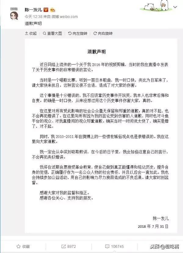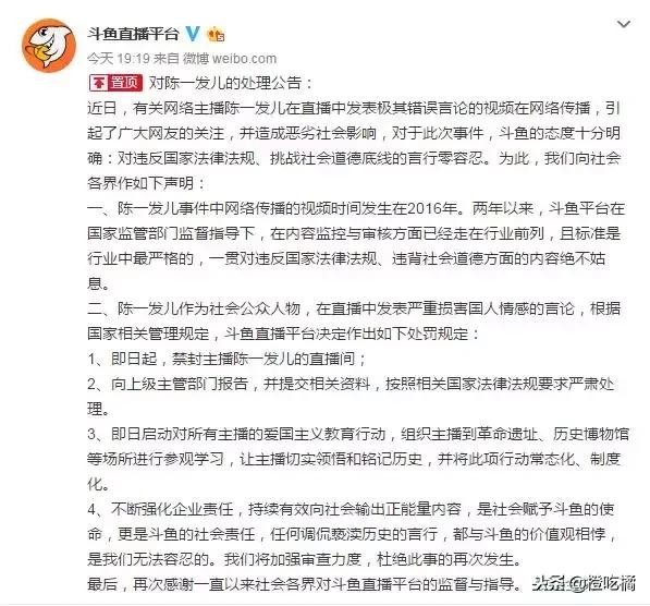 被曝光后,陈一发儿也是迅速做出了回应,但依旧没有逃过被封杀的命运,这条微博也成了最后一条动态,不光是斗鱼直播间被封、所有作品被下架,如今连微博貌似都已经找不到了!