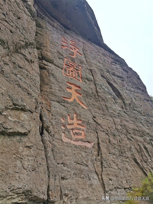 浮图天造,这个摩崖石刻没有落款时间,应该是今人所刻。源自清人纪晓岚《阅微草堂笔记》:山庄之西“有双塔峰,亭亭对立,远望如两浮图,拔地涌出,无路可上”。