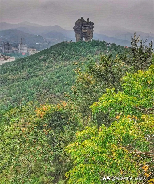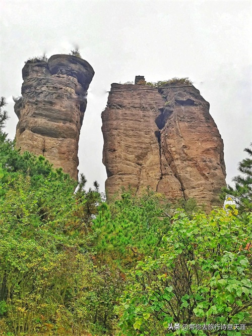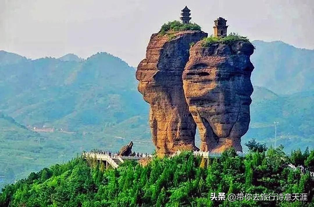 拔地相依两柱山,何时砖塔立峰巅?