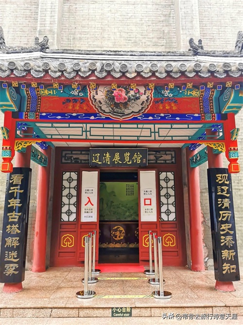 山脚下的展览馆,门前楹联:看千年古塔解迷雾,观辽清历史添新知。当地景区为打造千古之谜这个名片不遗余力。