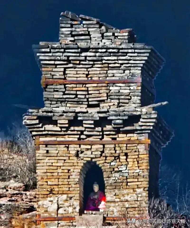 这是古砖塔,塔呈方形,边长约两米多,残留两层高5米左右。专家推测古塔修建于辽代,契丹人以两座石柱互为支点,在石柱间架设木梯盘旋而上,直到峰顶,然后将所有的建筑材料搬运上去。