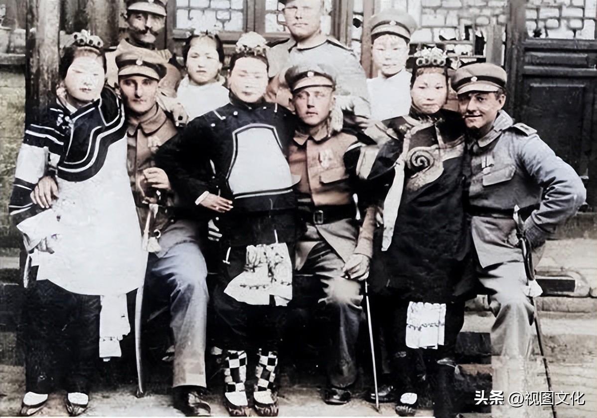 ▲西太后和光绪皇帝仓惶出逃,义和团也被迫退出北京,转往外地坚持抗击侵略者,这一年也称庚子国难,图为入城后的联军与青楼女子的合影。