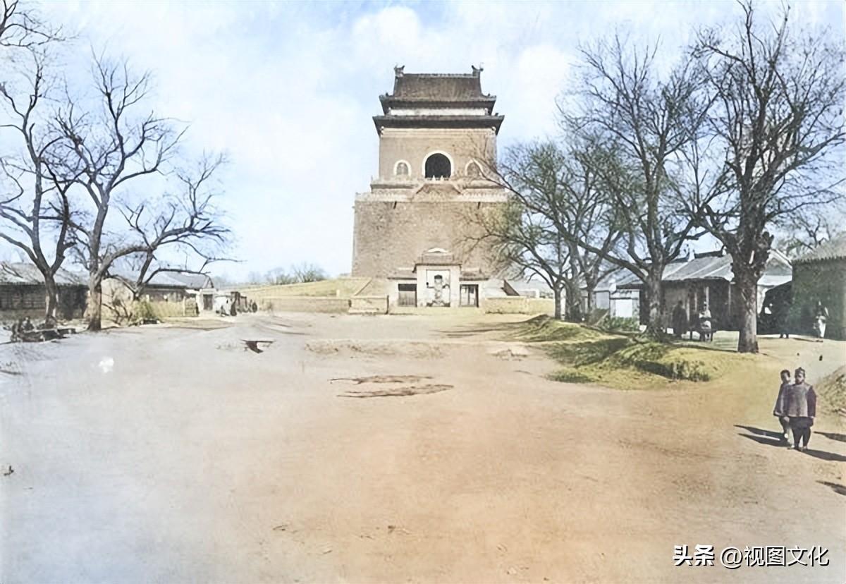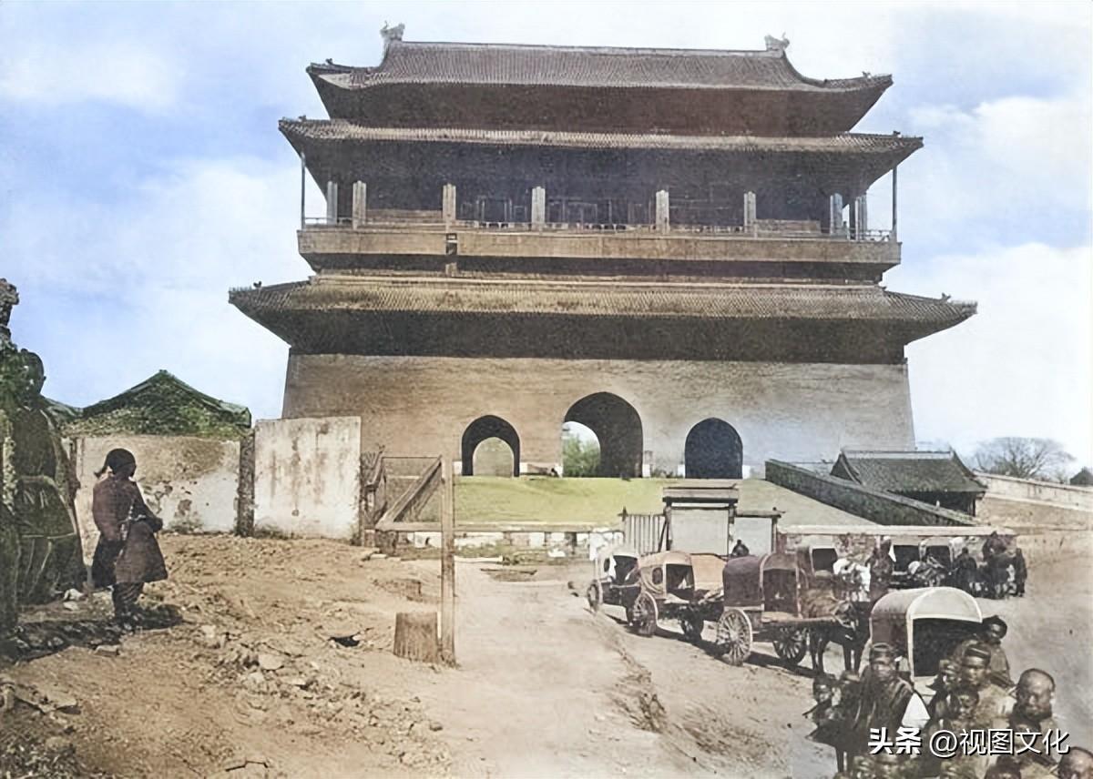 ▲1900年的北京鼓楼,元、明、清代都城的报时中心,是古都北京的标志性建筑之一,由台及楼两部分组成,楼基称台,有券门三座。