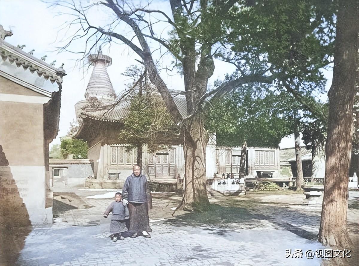 ▲1900年,妙应寺内,一对父子站在庭院内,远景为白塔寺白塔,故该寺俗称白塔寺。