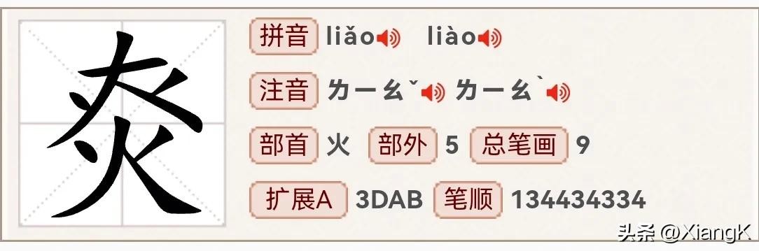 “㶫”字为多音字,读音为“瞭”&“辽”,同音字“liǎo”&“liào”,部首为“火”,总笔画9,上下结构。