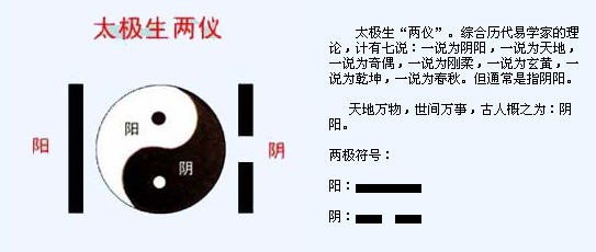 关于把两仪当作阴阳时,阴、阳两字的古义是背日和向日的意思,阴阳本无任何哲学内涵。阴、阳原自中国古人的自然观念,古时的人从生活中各种对立又相联的大自然现象,如天地、日月、昼夜、寒暑、男女、上下等,以哲学的思维方式,归纳出“阴阳”的概念,它是一种相对的而非绝对的概念。