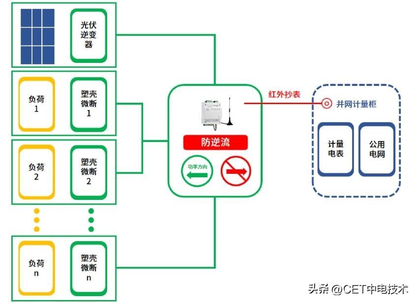 防逆流保护装置是一种电力保护技术,主要用于防止电力系统中逆流的发生以保护设备和系统的安全,通常在交流侧安装一个防逆流装置监测电流流向,来控制光伏逆变器的直流端发电。