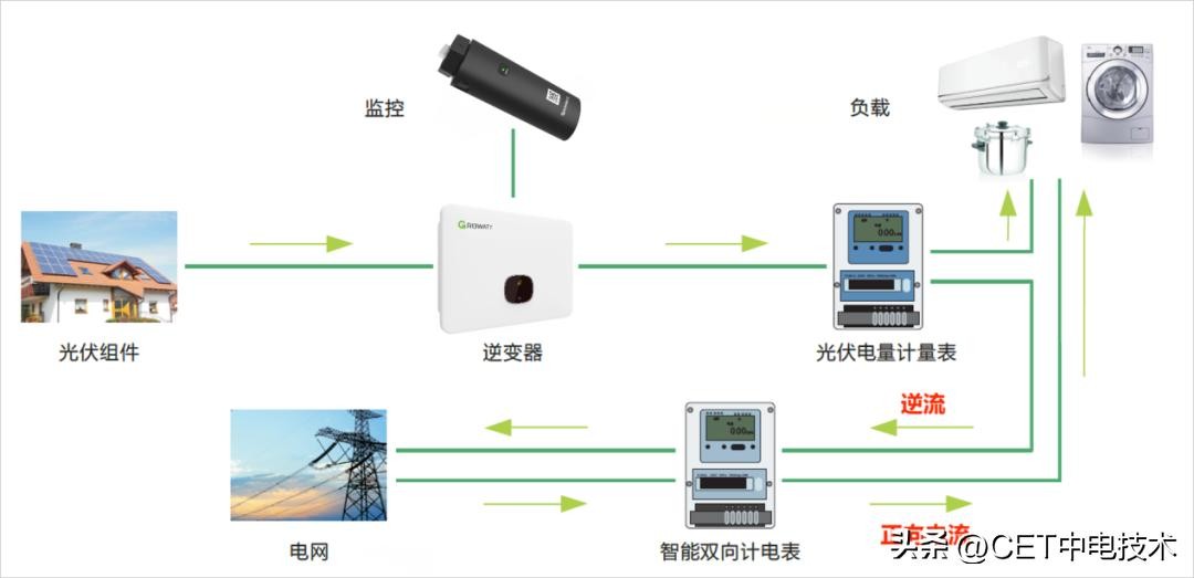 但在光伏系统中,当光伏系统功率大于本地负荷的功率时,消纳不完的电力要送入电网,由于这种能量的流动方向是光伏组件-逆变器-负载-电网,与电网系统的电流方向不一样,被叫做“逆流“。