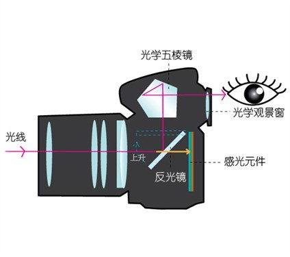 “反”说的是“反光”,相机内置一块倾斜放置的平面反光镜,取景时反光镜落下,反射从镜头进入的光线到五棱镜上,在经过五棱镜的折射最终到达取景器,拍摄时反光镜抬起,从镜头进入的光线直接照射在胶片或者影像传感器上(CMOS或CCD)。