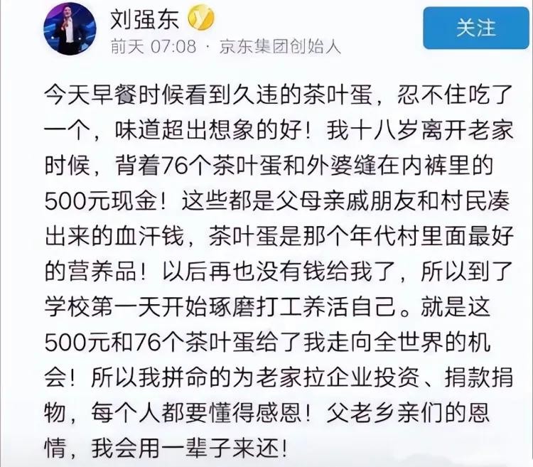 后来,贾府落难,还是刘姥姥给收的场,而当初送刘强东上中国人民大学的乡亲们,尤其是那众人凑的500元和几十个茶叶蛋,到如今的几千万春节年货,便跟这戏曲一样,耐人寻味!
