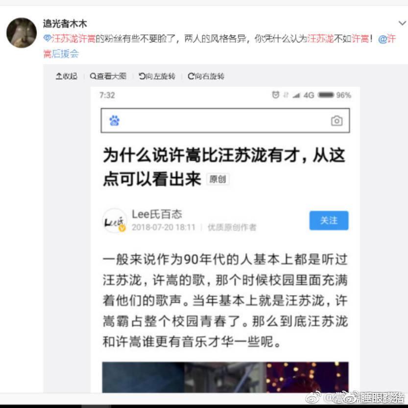 有一个叫做@追光者木木 的同学,在看到某平台自媒体为了引流写的文章后,在汪苏泷超话大骂许嵩粉丝没有脸。