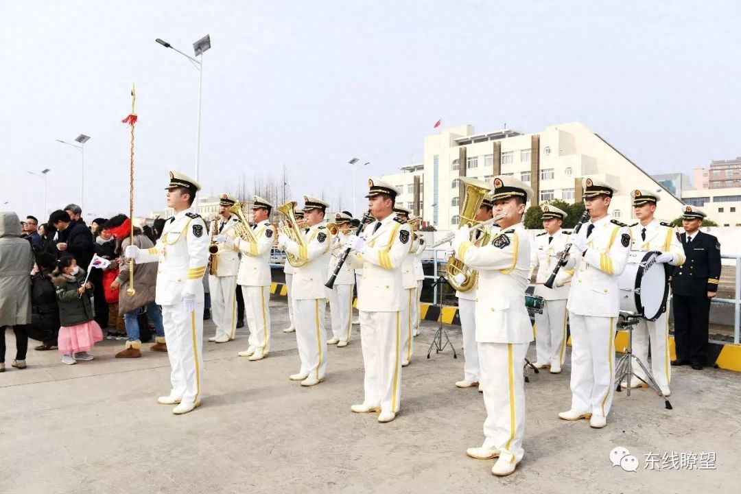 军乐队奏响欢快的迎宾曲,60名水兵拉起巨幅欢迎横幅,数名带缆兵在缆位前就位……