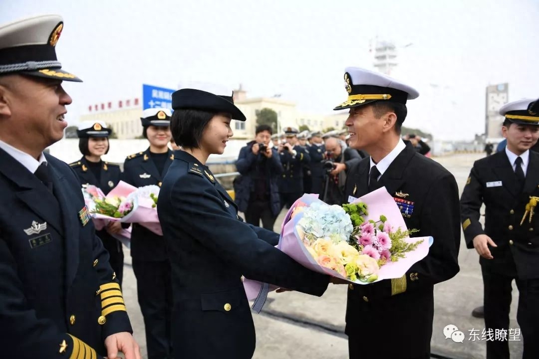 中方女兵向韩国海军舰艇编队指挥员李寿烈准将献花。