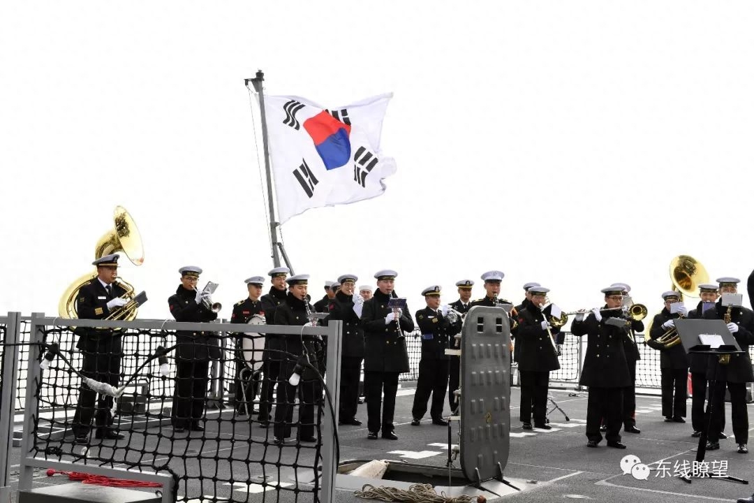 韩方官兵在“忠武公李舜臣”号驱逐舰直升机甲板奏响军乐。