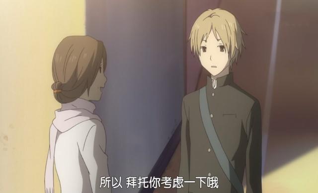 当初封了了妖怪的夏目,也摔下了山下。不过还好,并没有出什么事,在医院要躺一段时间。当然也是这一次让夏目下定决定去藤原一家,可能就是因为察觉到了塔子阿姨的温暖,所以夏目才会这么义无反顾吧。这个叫做藤原塔子的温暖阿姨,真的给了夏目与众不同的感觉。可能这就是所谓的亲情吧。