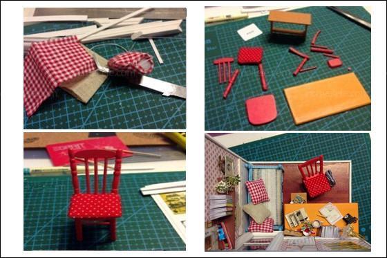 ④diy小屋中椅子和桌子是比较多的,而且做起来也是比较麻烦的。其实这些东西只需要一个一个部件来做最后组合在一起就简单了,比如说做椅子,首先把椅子的椅背,椅脚还有坐垫一一做好,然后再用胶水或者是强力胶粘贴在一起即可,因为部件很小,需要用牙签来粘贴胶水。