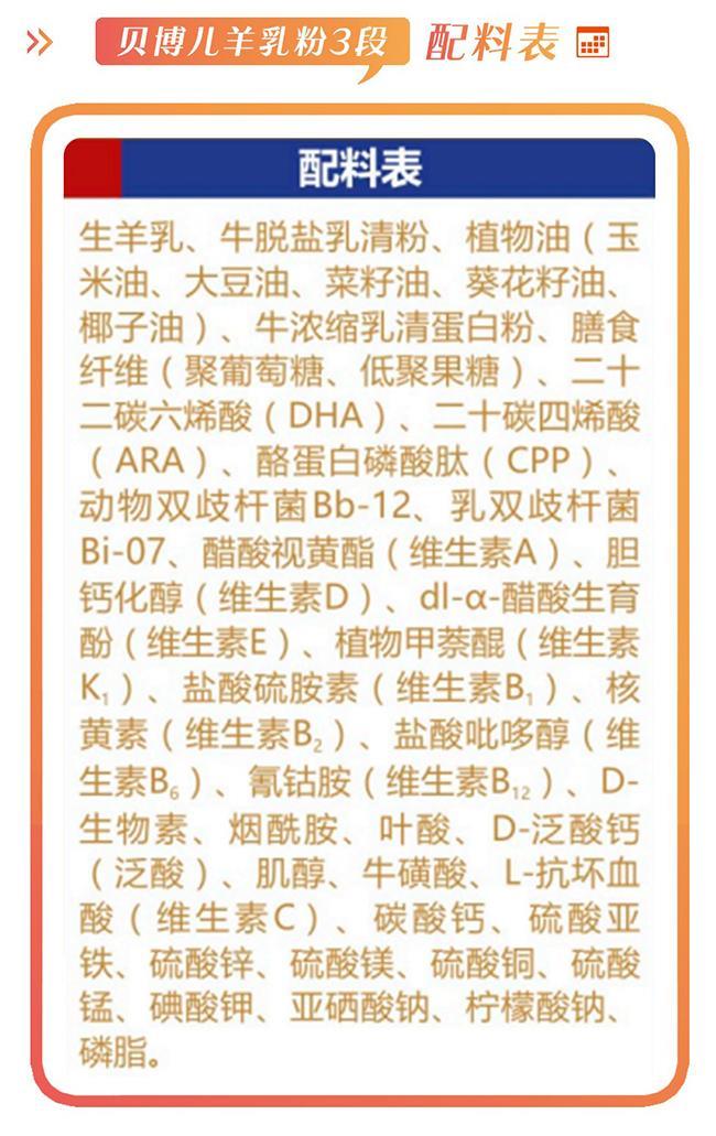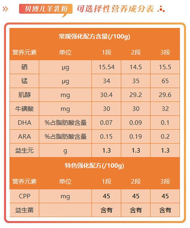 在营养与配方上,贝博儿羊乳粉添加的基础营养配方严格遵守国家标准,小编在此就不多说,我们具体谈谈大家比较关心的可选择成分。贝博儿羊乳粉全段添加9个可选择成分,包括7个常规强化配方和2个特色强化配方。