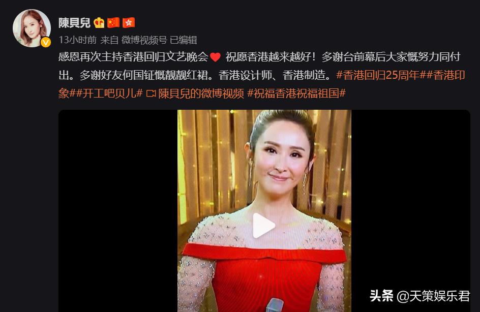 汪明荃、陆浩明、陈贝儿三人同台挑大梁主持文艺晚会,看起来非常协调自然。陈贝儿2003年,加入香港有线娱乐新闻台担任主播;2022年2月,参与演唱献唱抗疫歌曲《狮子山下同心抗疫》 ;3月3日,被评为“感动中国2021年度人物”。陈贝儿的主持获得了网友的无数好评,陈贝儿也发文称:感恩再次主持香港回归文艺晚会,祝愿香港越来越好。