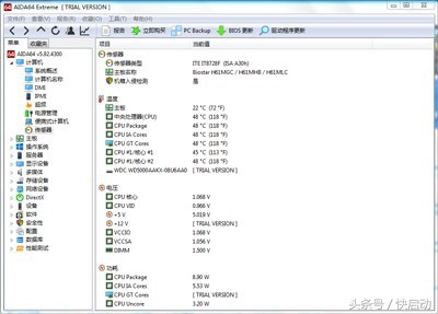或者使用Aida64软件查看电脑硬件温度。AIDA64是一款电脑硬件检测工具,除了检测电脑硬件配置之外,可以监测电脑硬件的温度,还可以监测风扇的转速和电脑功耗。下载安装并运行后,在然后点击左侧菜单中的“传感器”,在右侧就可以查看CPU等核心电脑硬件的温度了。