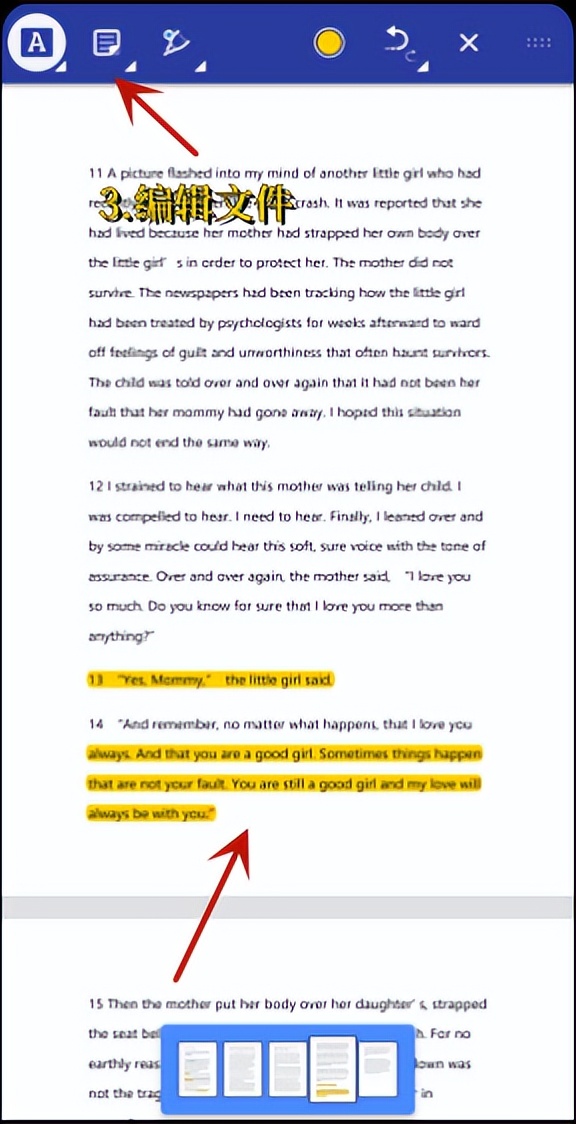 第三步:文件导入后,就可以对文件中的页面内容进行编辑了,点击选择上方的图标,可以标注文档中的重点内容,对文档内容做注释等,在页面底部还可以自行给文件添加水印等,最后保存修改后的文件即可。