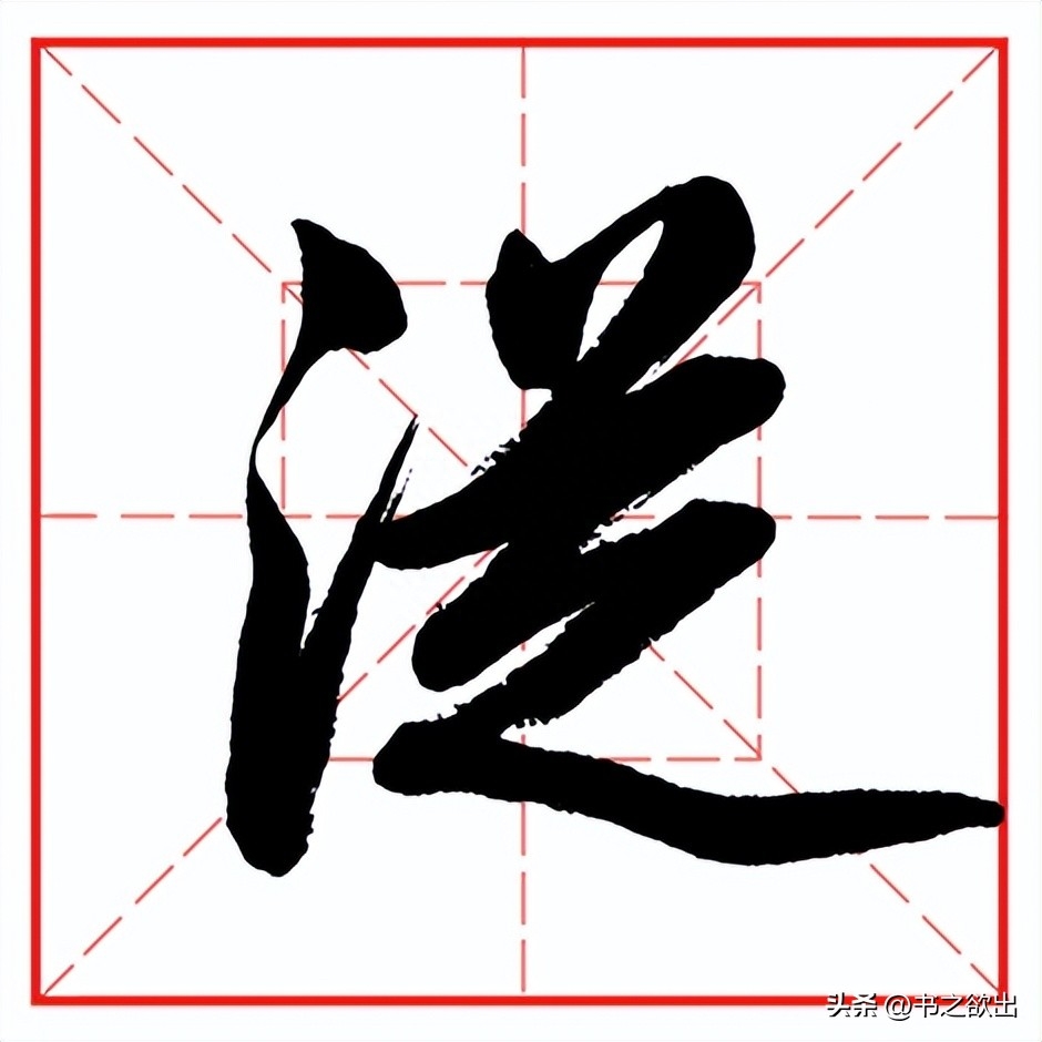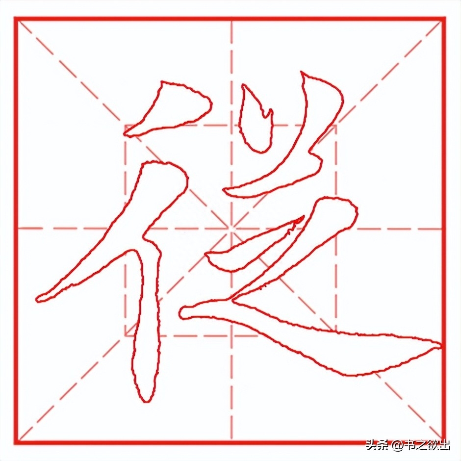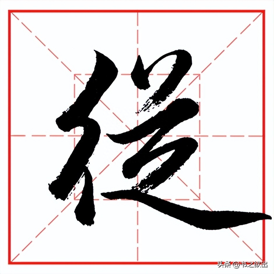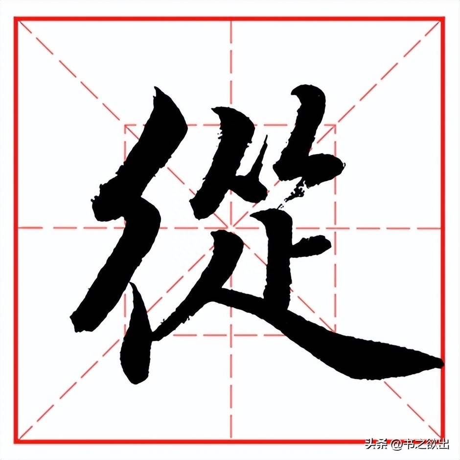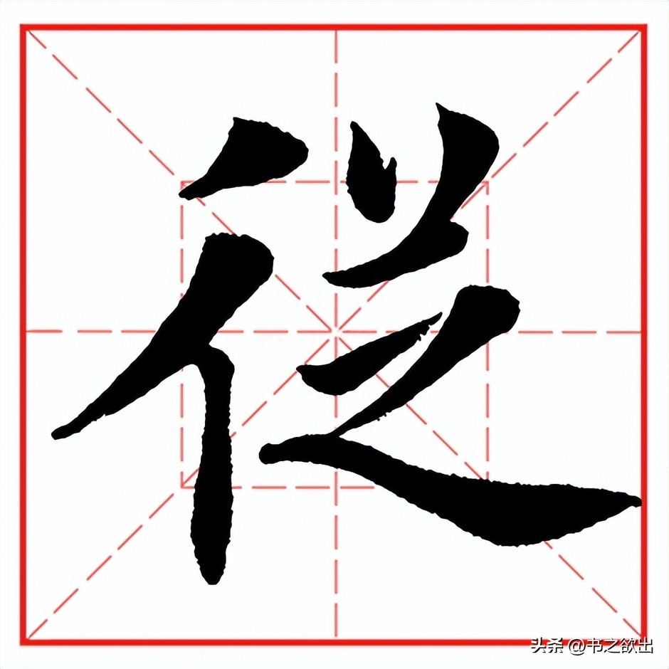 左边“彳”勿宽,首撇以斜切起笔,落笔后随即转锋向左快速提锋撇出,短促有力,角度略平;第二撇起笔稍偏左,撇身稍直,行笔指向与首撇不同,收笔力达撇尖,不可一笔甩出;竖笔与撇画虚接,竖身稍细,稍左斜,收笔垂露。