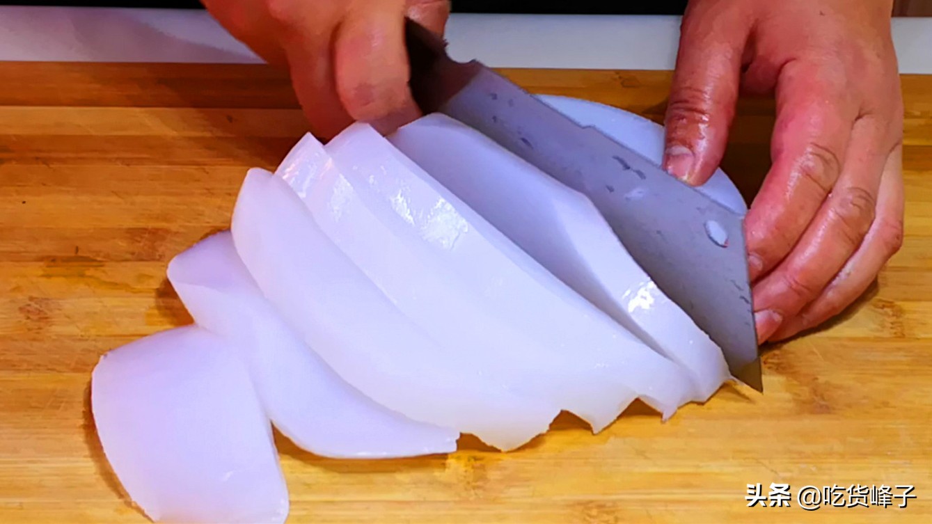 5.凉粉大约冷却一个半到两个小时即可定型,定型后的凉粉,我们把它切成长条。