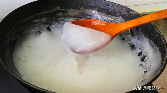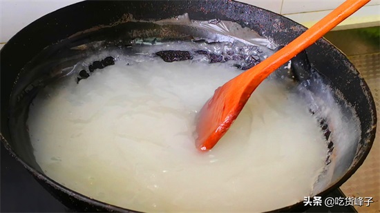 2.锅内加入800克清水,再把调好的豌豆糊倒入锅中,然后开小火开始熬,这个过程还是要不停地搅拌,因为搅拌不及时,淀粉沉淀以后很容易糊锅,大约熬制5~6分钟的时间,你会看到,水淀粉已经变成了粘稠的淀粉浆,这时候千万不要停,继续加速搅拌。