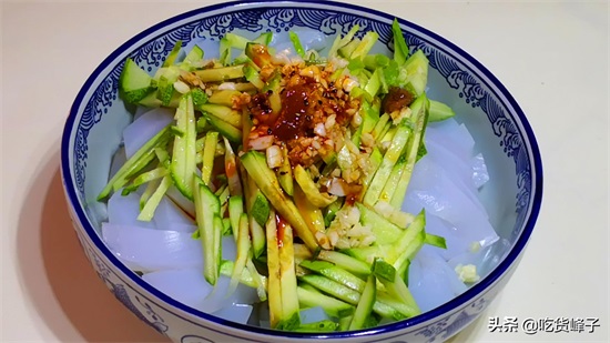 6.切成条的凉粉放入碗中,加入提前切好的黄瓜丝和蒜末,再调一下味:加入1勺白糖,适量味极鲜,蚝油,米醋,麻油,辣椒油搅拌均匀,喜欢吃麻汁的可以再加入适量麻汁,清凉爽口的自制凉粉就做好了。