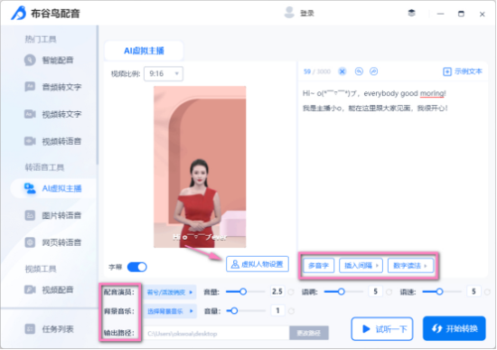 AI虚拟主播】,里面有多种主播形象、背景、音色供你选择,最重要的是可以自定义多音字、间隔、数字读法、语调、背景音乐等,因此播报效果非常自然,完全不会机械化!