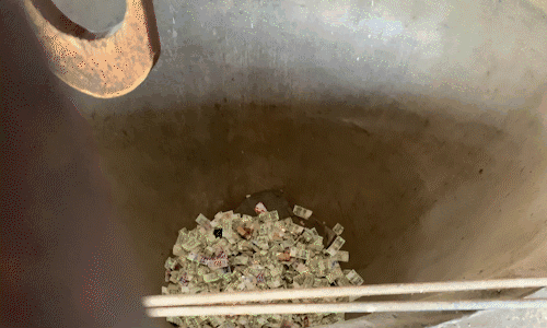 什么锅,让他们这么兴奋,顺着他们呼喊的声音,我到后厨那屋,一进门就看到栅栏后面的一口深不见底的大锅,看到这口锅,我确实也有点吃惊,直径有个三四米,里面扔满了钱币,深估计有个两米左右,从上锅台到下面添火的地方,需要走旁边的台阶。
